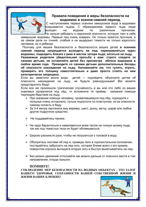 - Правила поведения и меры безопасности на водоемах в осенне-зимний период.